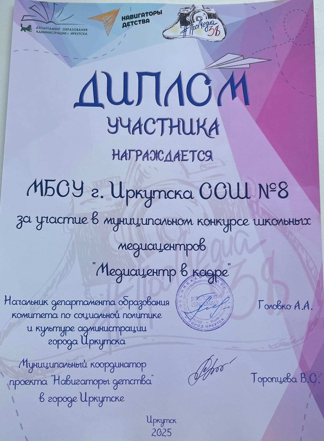 Диплом МБОУ г. Иркутска ООШ №8 за участие в муниципальном конкурсе школьных медиацентров "Медиацентр в кадре"