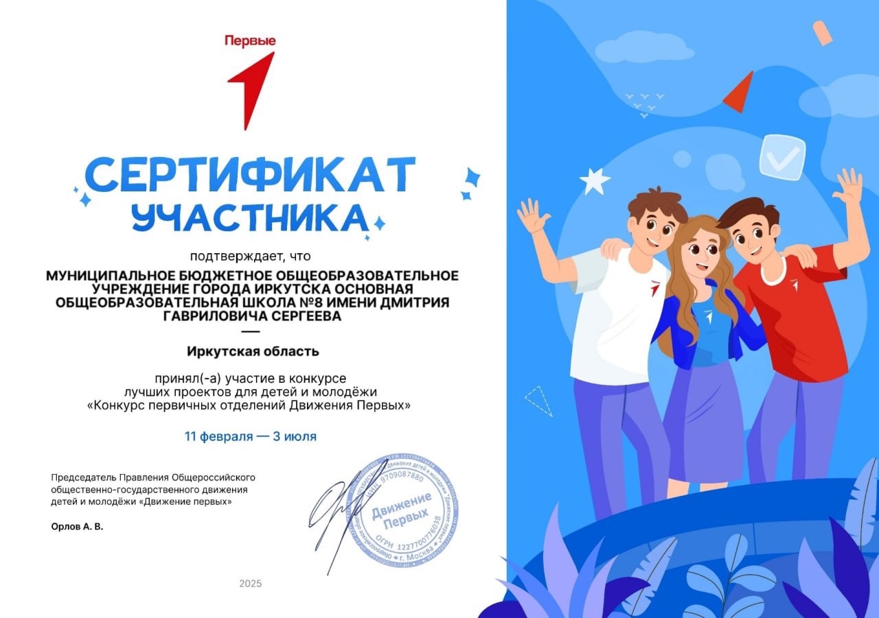 Сертификат МБОУ г. Иркутска ООШ №8 за участие в конкурсе лучших проектов для детей и молодежи "Конкурс первичных отделений Движения Первых"