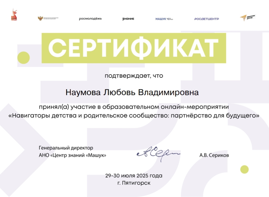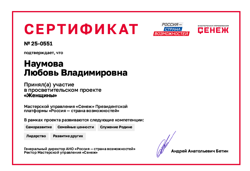 - Участник Просветительского проекта "Женщины" Мастерской управления "Сенеж" Президентской платформы "Россия - страна возможностей", 2025 г.;
