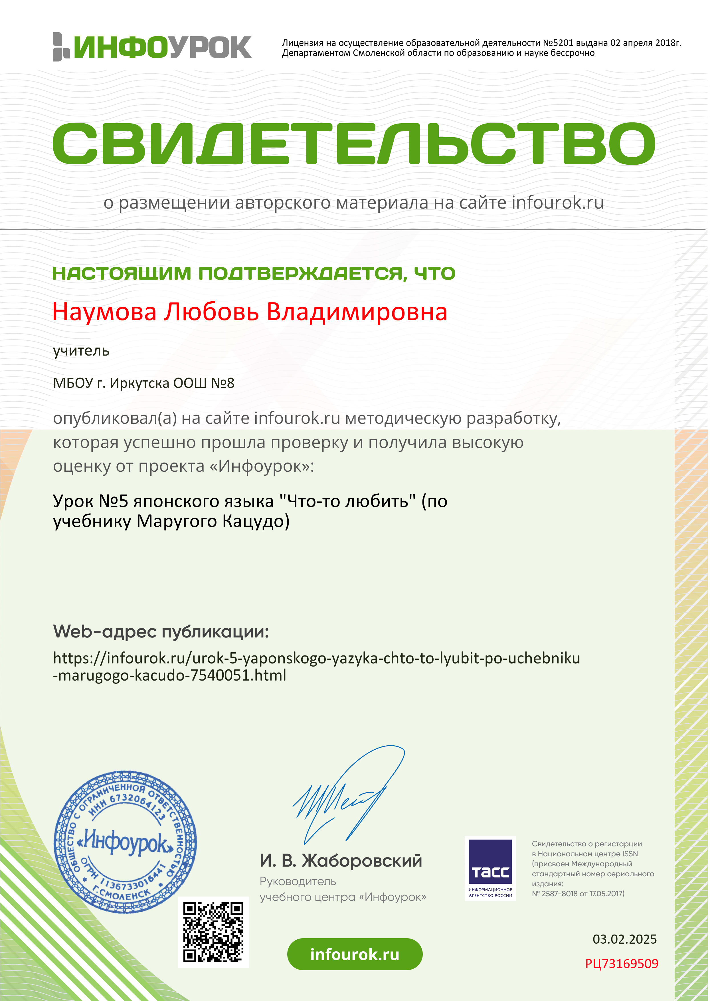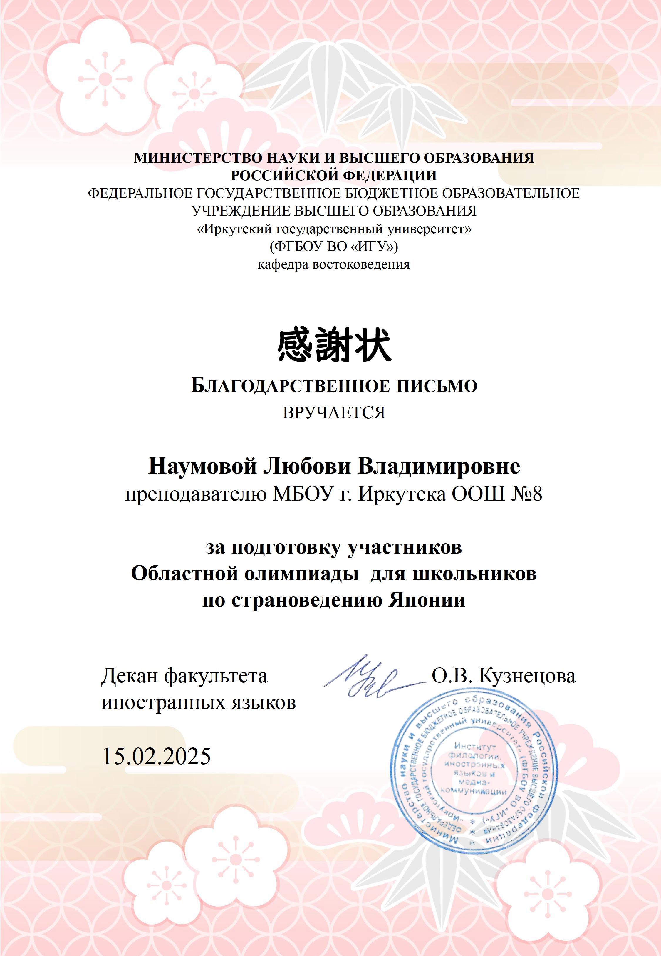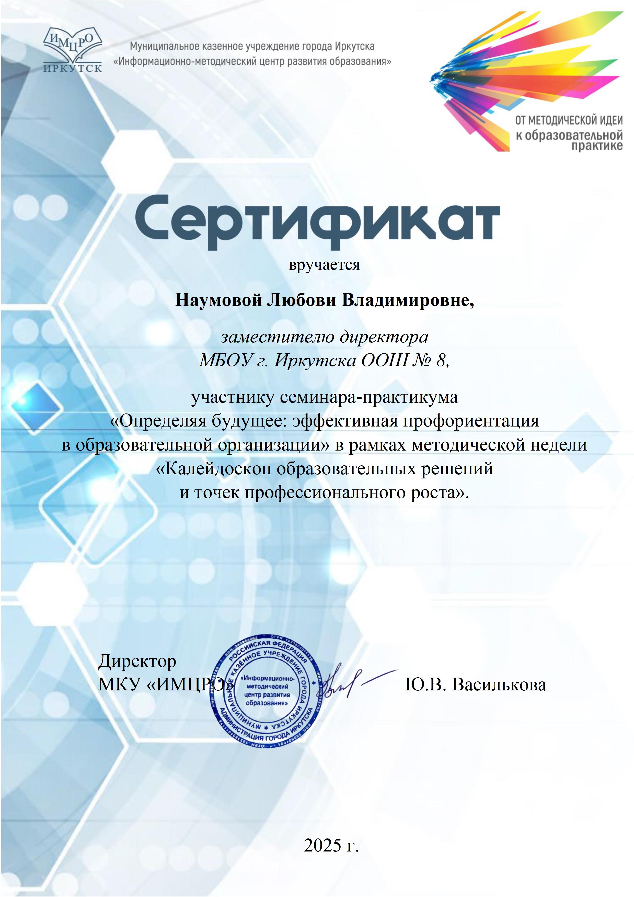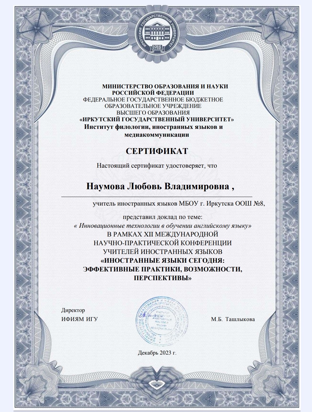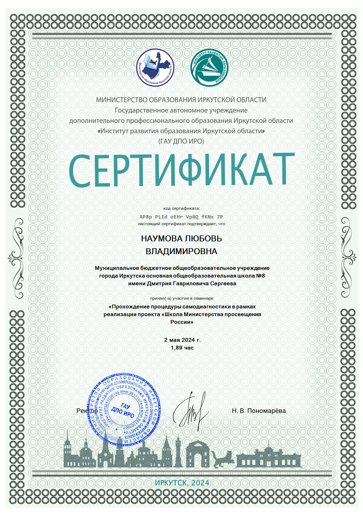 - Менеджмент и экономика образования. Школа молодого руководителя», 26.02.2024-17.05.2024, ГАУ ДПО ИРО (г. Иркутск) (300 ч.)