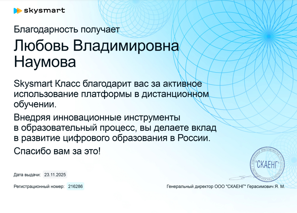 - Наставник победителя и суперпобедителя Второго всероссийского чемпионата юных писателей и поэтов «О России с любовью – 2024»;