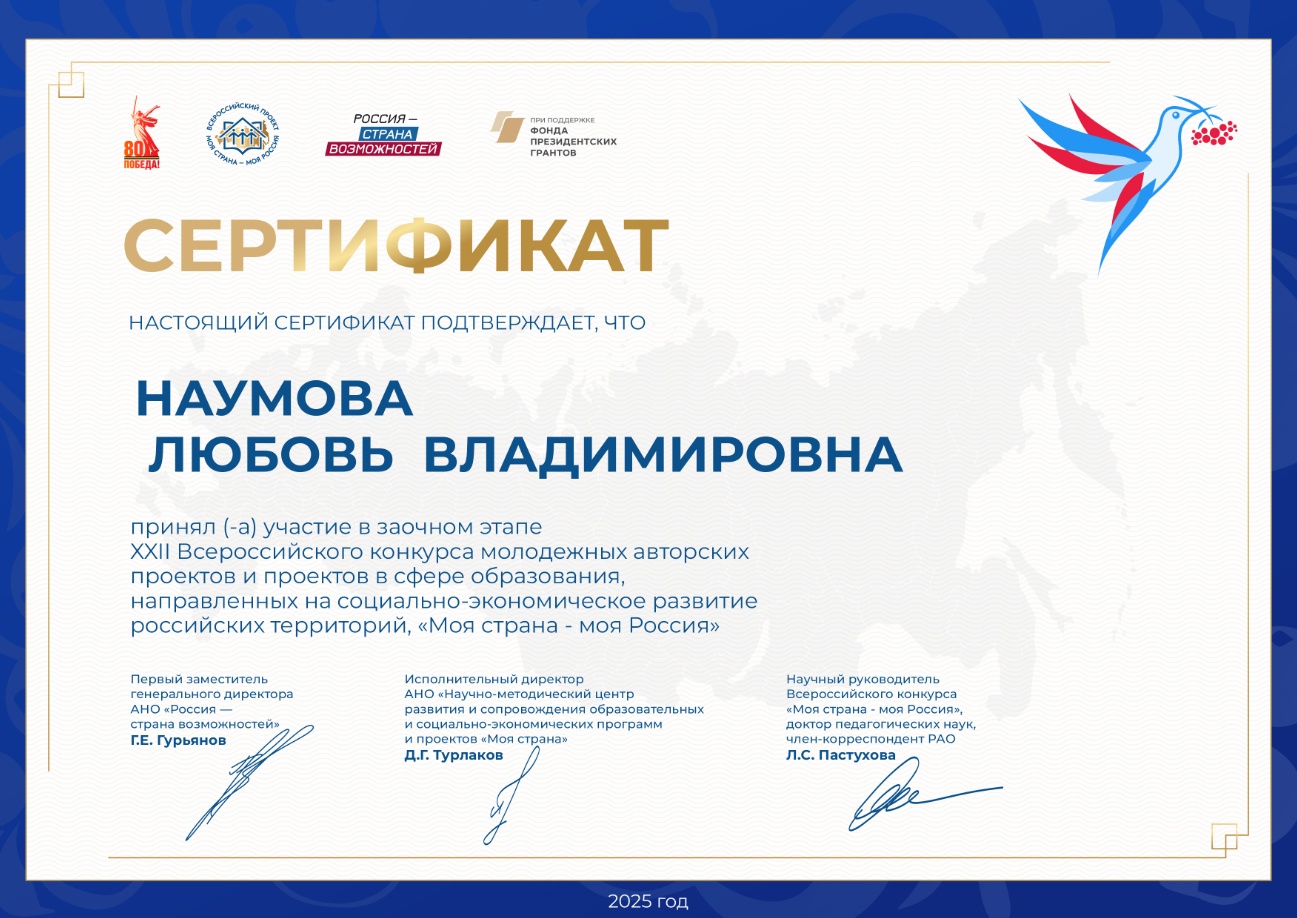 - Участник Всероссийского конкурса «Моя страна – моя Россия»;